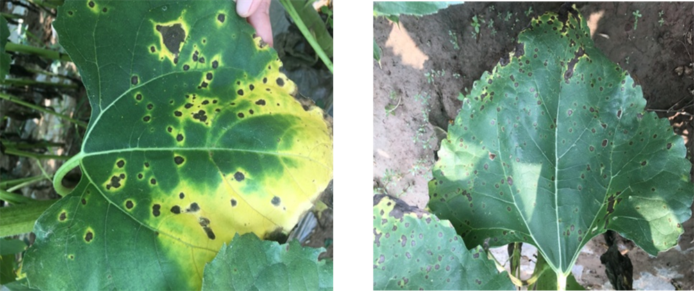 症状:可危害油葵叶片、叶柄、茎和花盘,一般在开花后发生,发病初在叶片上产生直径为1-3厘米的褐色小点,扩大后呈圆形、椭圆形或不规则形的褐色大斑,中央色淡。呈灰白色,有或无同心轮纹,有时数个病斑融合形成大块枯斑,使叶片局部焦枯、破裂或形成穿孔。