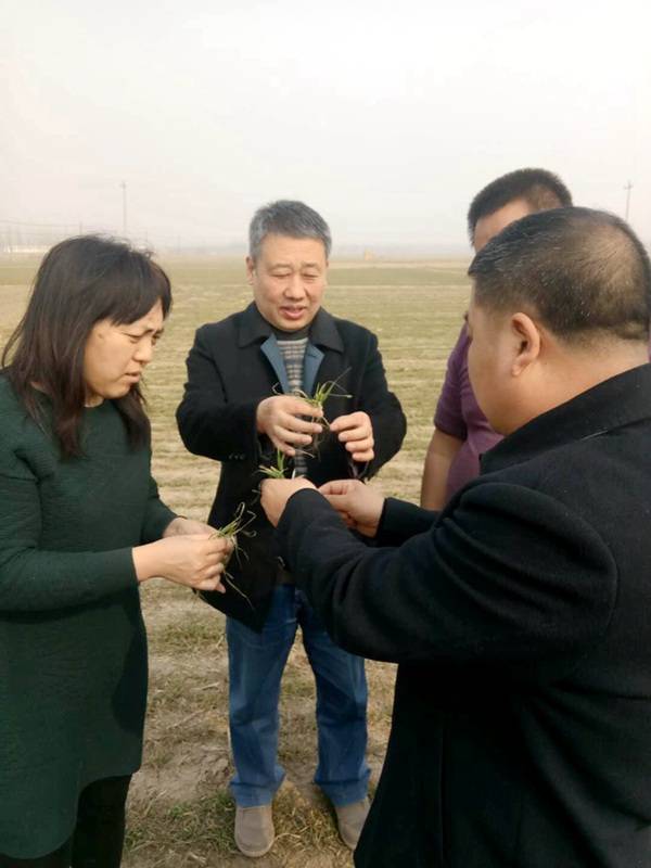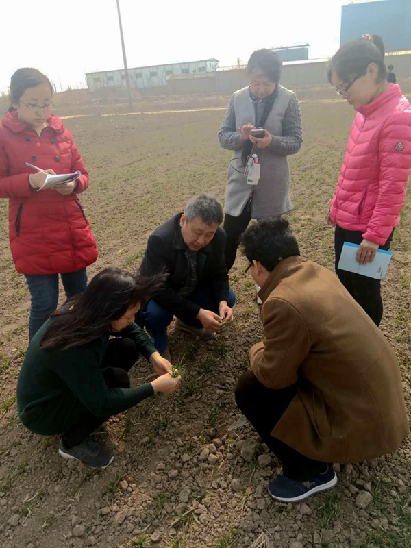 3月13日,王奉芝研究员带领沧州市农牧局技术站一行6人到示范县调查苗情,重点调查了东部旱地和西部水浇地麦田的小麦生长情况。今年小麦苗情普遍偏弱偏晚,一、二类苗比例比去年减少27.8%,三类苗比例比去年增加28.3%,没有旺长麦田;亩总茎数比去年减少17万,单株分蘖减少1.4个。调查结束后,王奉芝研究员和有关农技人员建议小麦春季管理分类指导,科学运筹肥水,促控结合,构建合理群体,做好“一喷三防”,促穗增粒争粒重,确保小麦增产丰收。