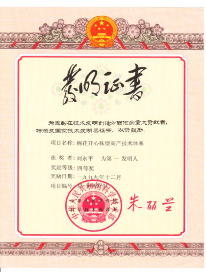 “八五”期间,承担国家科技攻关项目,创新棉花开心株型高产栽培新技术,解决常规株型“稀植高放易晚熟,密植郁闭易徒长”的关键技术难题,鉴定为国内外首创,居国内领先水平,列入农业部主推技术,推广面积210万亩,创经济效益1.64亿元,人民日报、科技日报、光明日报等新闻媒体宣传报道,社会效益显著,1999年获国家科技发明奖。