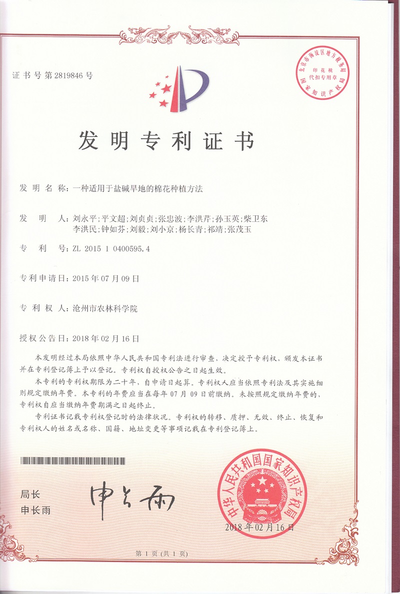 我院农田高效研究所创新的《一种适用于盐碱旱地的棉花种植方法》获得国家发明专利,专利号:ZL 2015 1 0400595.4。