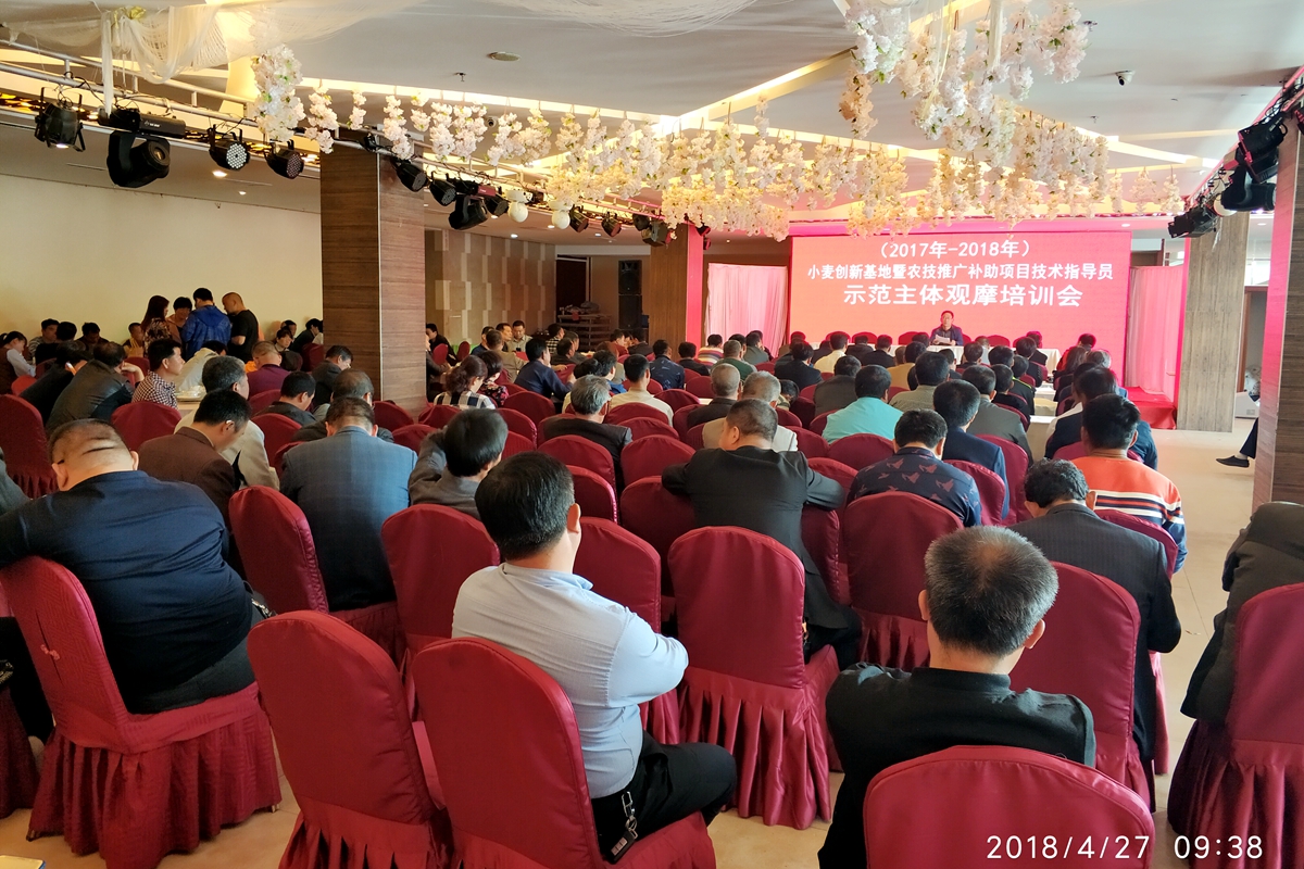 4月27日上午,根据小麦产业技术体系安排,我院小麦试验站在献县献王大酒店组织召开技术培训及创新基地现场观摩会。赵松山研究员详细讲解了今年沧州市小麦生态及生长发育特点和苗情状况,针对当前情况进行了小麦中后期管理技术的培训。于亮副研究员在献县原种场向与会人员详细讲解了创新试验基地建设概况、黄淮冬麦区良种联合攻关试验、旱地施肥及节水试验等情况。